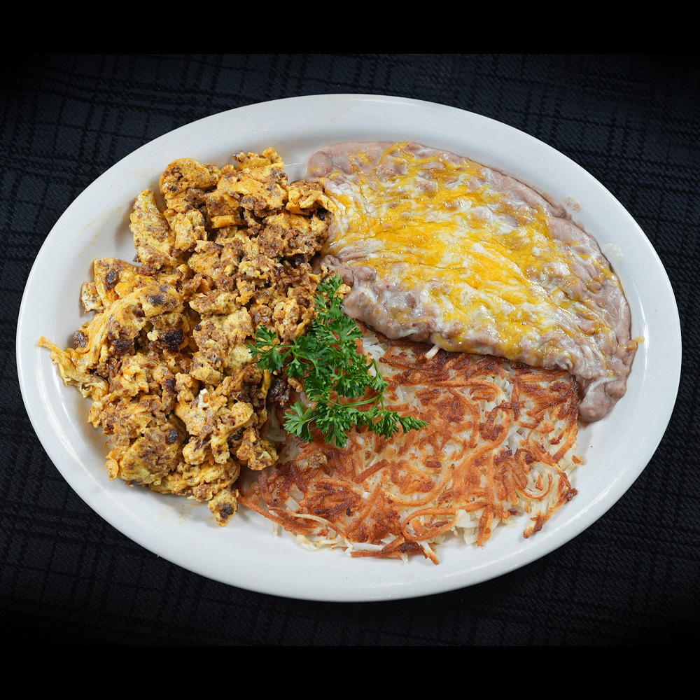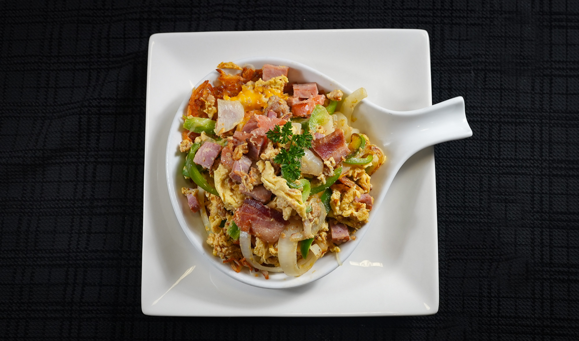 Ham, bacon, sausage, two eggs, home fries & cheese