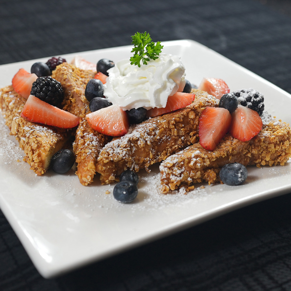 Thick slices of bread dipped in a cinnamon batter, coated in crushed cereal, topped with fresh berries, powdered sugar & whipped cream