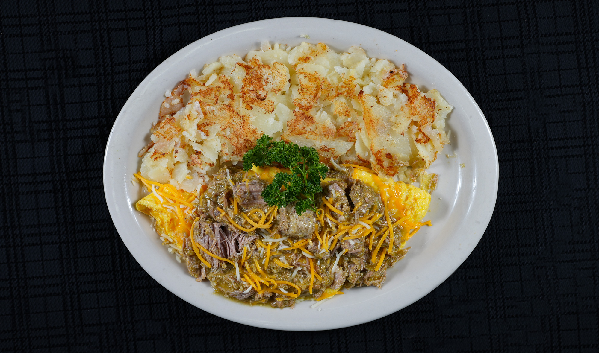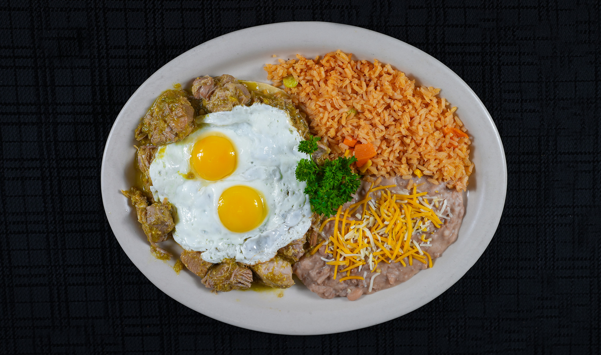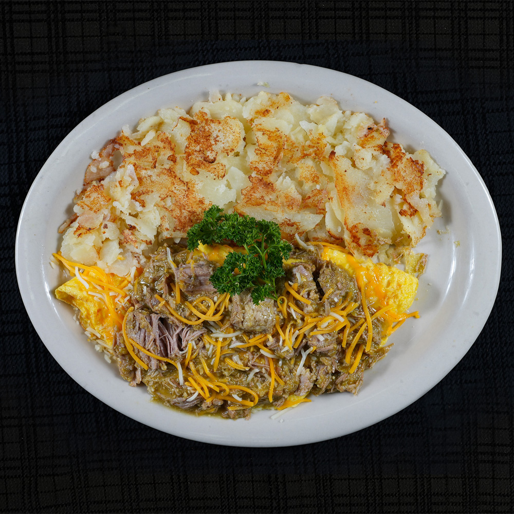 Two eggs any style topped with chunks of pork with green sauce & cheese over a soft tortilla