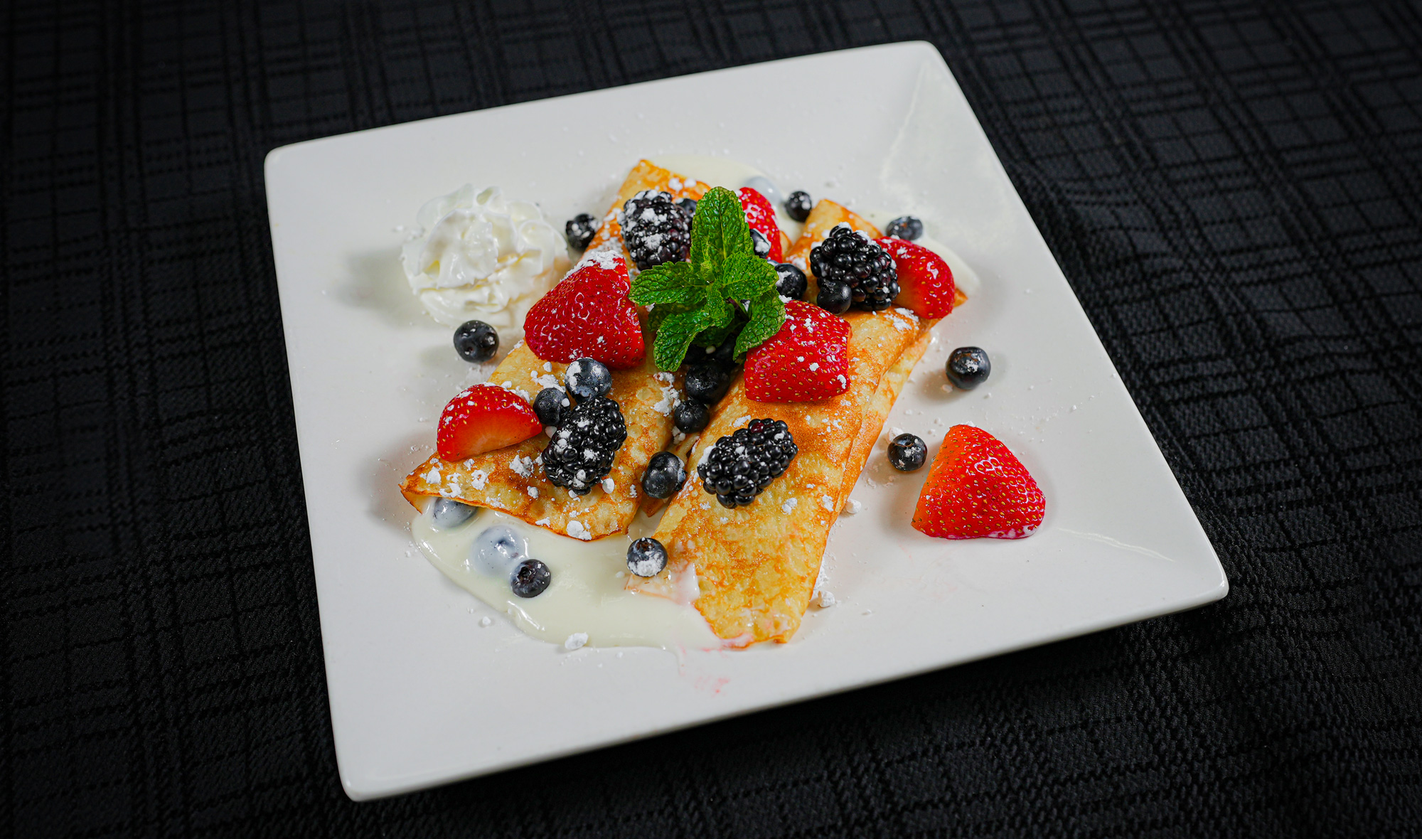 Two sweet cream cheese filled crepes topped with mixes berries, powdered sugar & whipped cream
